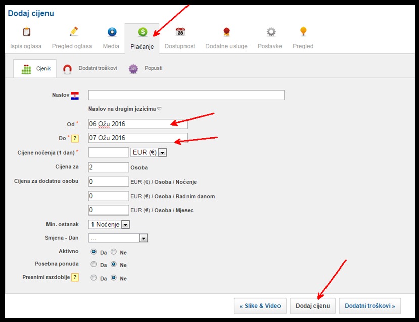 Nakon dodavanja slika idete na tab "Plaćanje" te unosite podatke o cijenama. Za svake određeni period u sezoni imate mogućnost odrediti svoju cijenu: