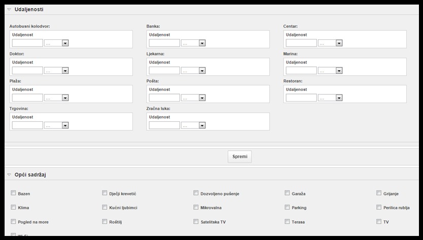 Unosite podatke o udaljenostima i sadržaju smještajne jedinice: